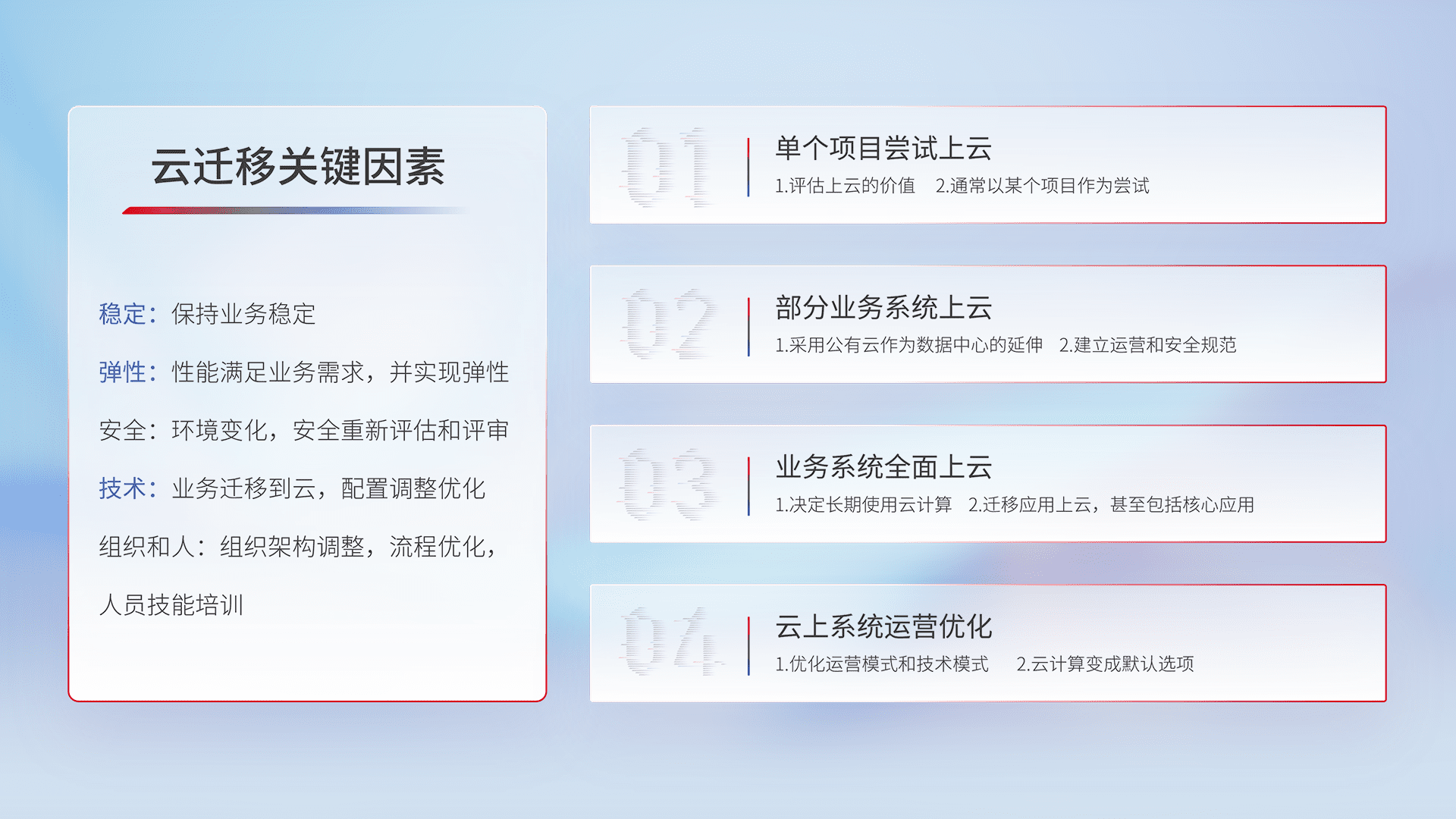 结合实际业务,,从规划设计、、、云平台选型、、、、云原生改造、、、数据迁移、、集成交付,,,,迁移全过程为客户识别最佳上云路径,,,,做好风险识别管理,,,设计网络架构、、、、身份权限、、、、安全审计合规、、、操作审计、、日志审计、、、监控告警策略、、多站点容灾设计等,,对云上基础设施进行整体规划,,,,提升IT治理水平,,以满足弹性、、高可用、、、、高性能的需求。。。。